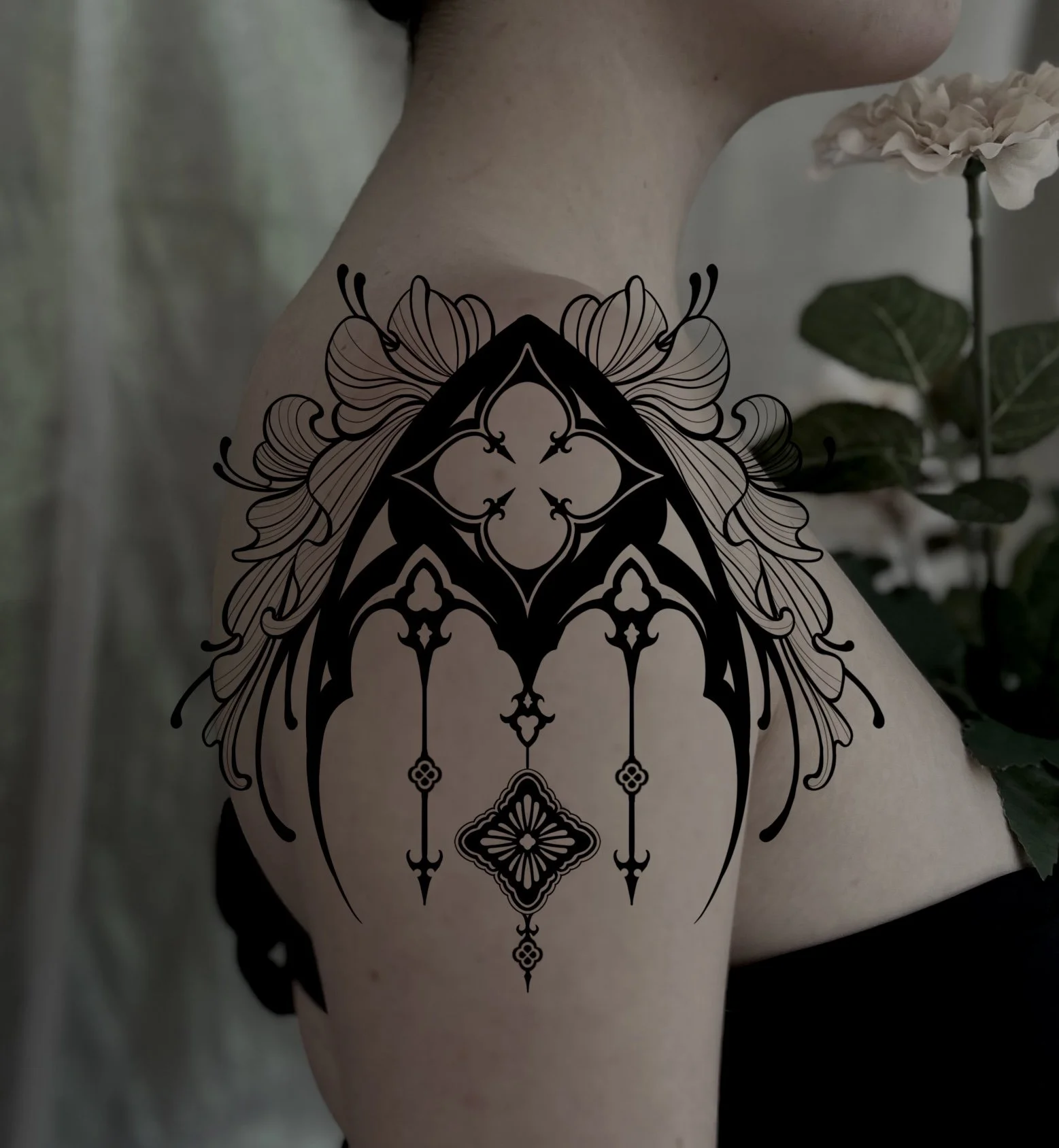 Bold and contouring ornamental tattoos frame you as the artwork.